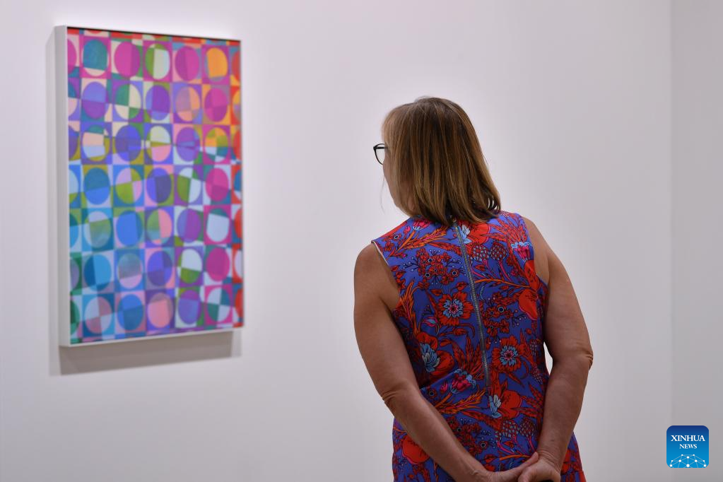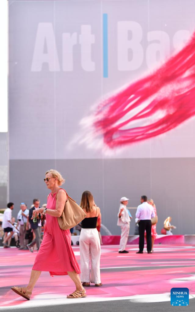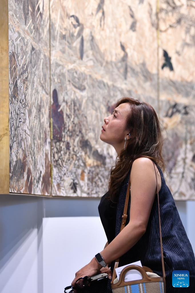 BASEL, 22 junio, 2025 (Xinhua) -- Imagen del 21 de junio de 2025 de una mujer visitando la exposición Art Basel 2025, en Basel, Suiza. La Art Basel 2025 se lleva a cabo en Basel, Suiza del 19 al 22 de junio. El evento de cuatro días reúne a más de 280 galerías de primer nivel que presentan obras de más de 4000 artistas de todo el mundo. Desde su fundación en 1970, la feria anual reúne a galerías, coleccionistas, curadores y artistas para exposiciones, ventas y programación. (Xinhua/Lian Yi)