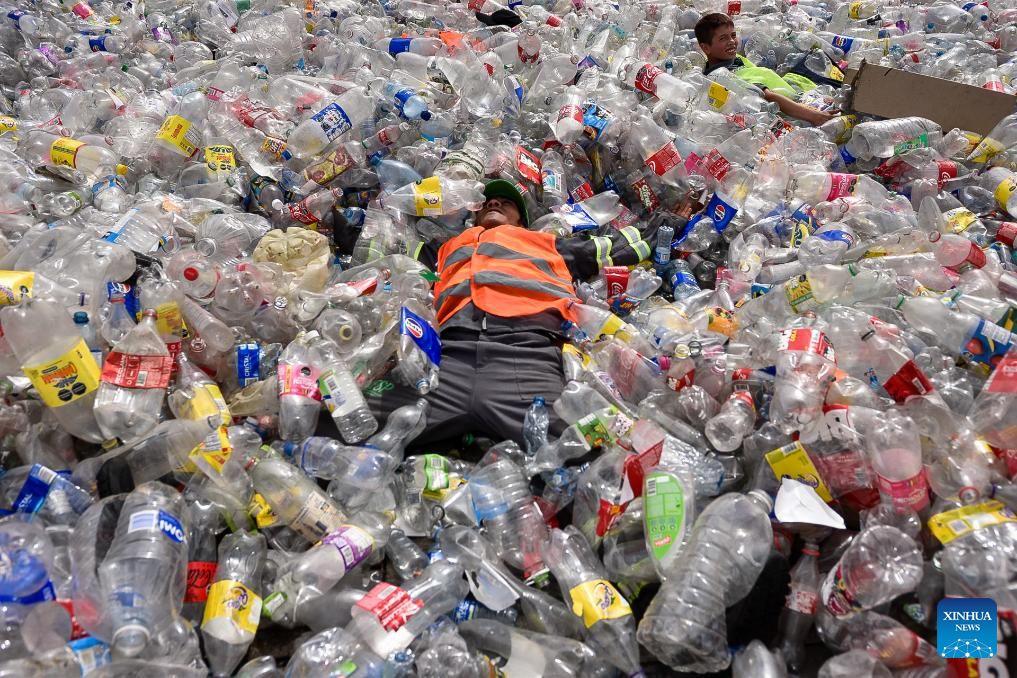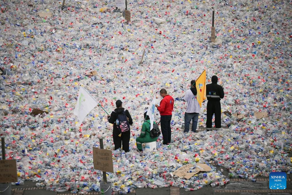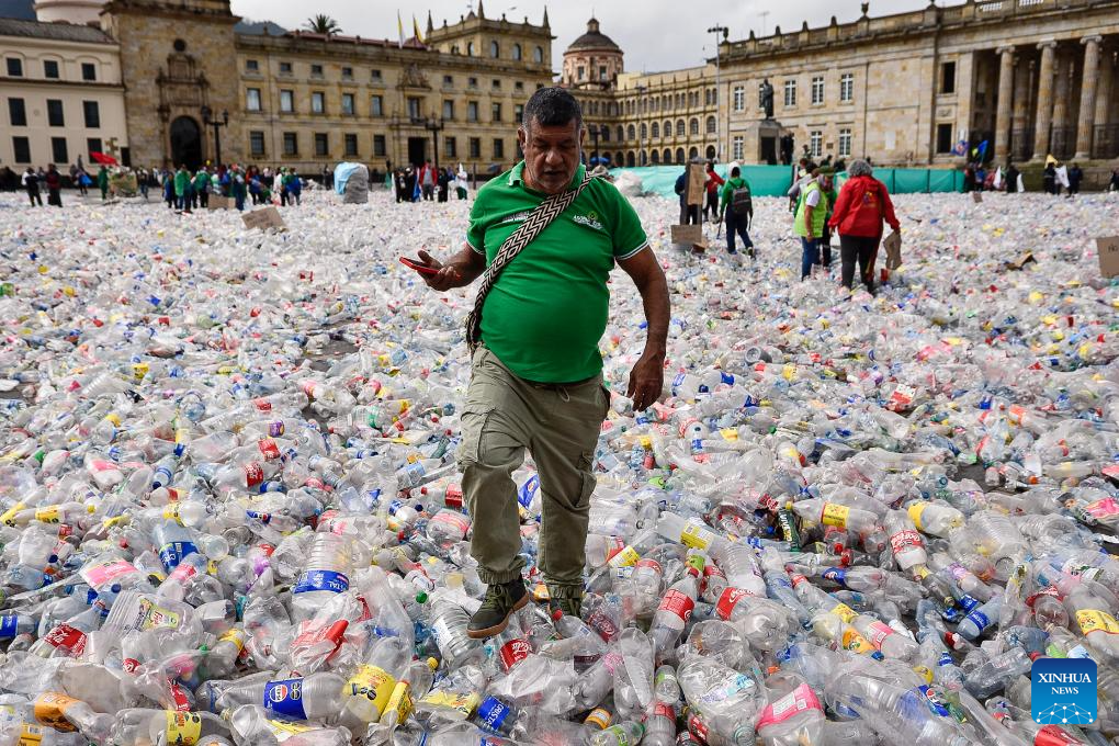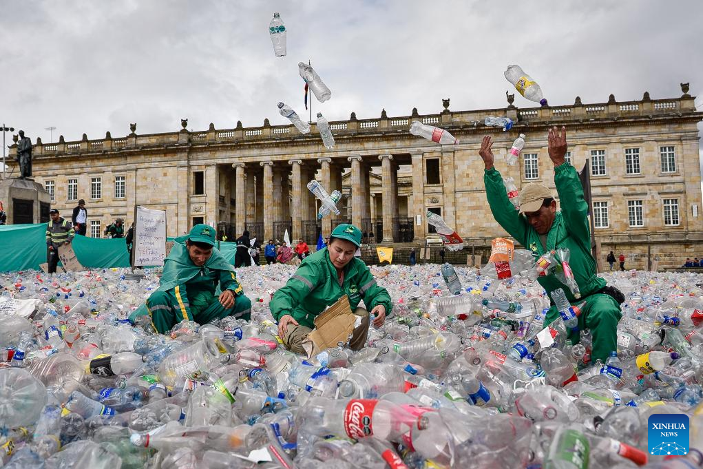 BOGOTA, 24 junio, 2025 (Xinhua) -- Imagen proveída por COLPRENSA de recicladores participando en una manifestación en la que cubrieron con botellas reciclables la Plaza de Bolívar, en la ciudad de Bogotá, capital de Colombia, el 24 de junio de 2025. (Xinhua/Cristian Bayona/Colprensa)