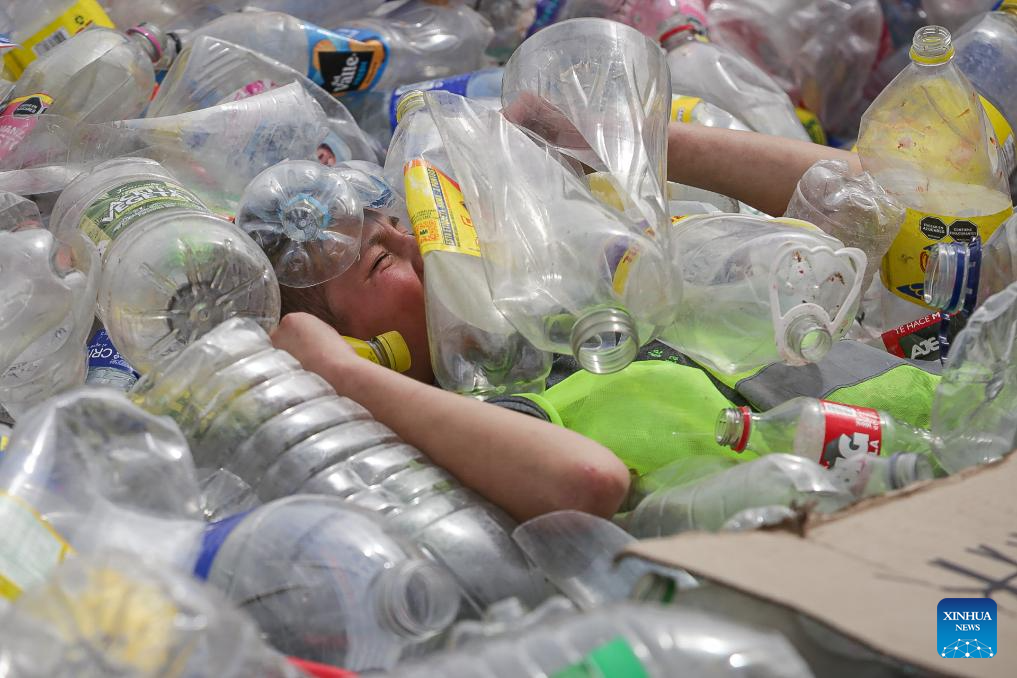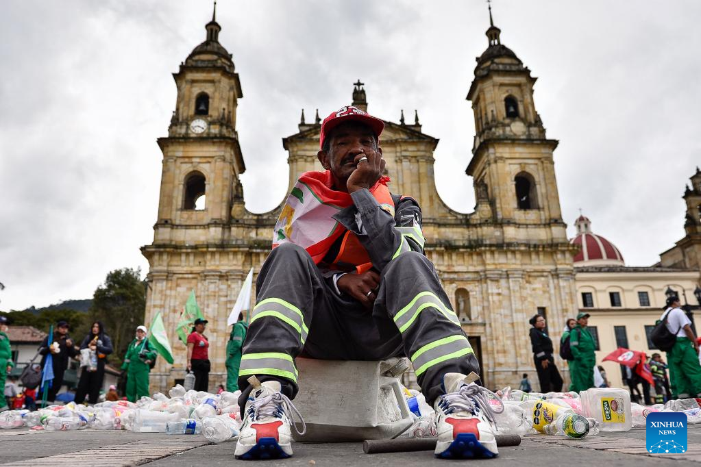 BOGOTA, 24 junio, 2025 (Xinhua) -- Imagen proveída por COLPRENSA de un reciclador participando en una manifestación en la que cubrieron con botellas reciclables la Plaza de Bolívar, en la ciudad de Bogotá, capital de Colombia, el 24 de junio de 2025. (Xinhua/Cristian Bayona/Colprensa)