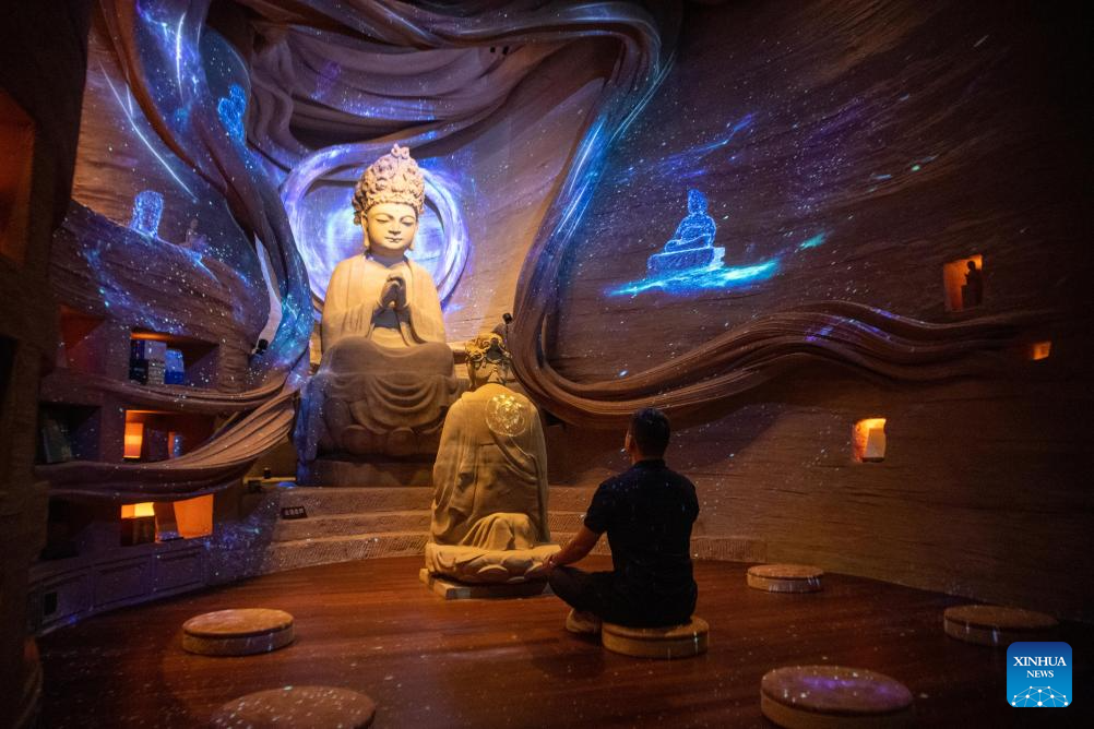 CHONGQING, 25 junio, 2025 (Xinhua) -- Imagen del 24 de junio de 2025 de un turista experimentando un escenario audiovisual digital en el punto escénico de los Grabados Rupestres de Dazu, en la municipalidad de Chongqing, en el suroeste de China. Los Grabados Rupestres de Dazu, un Sitio del Patrimonio Mundial de la UNESCO en la municipalidad de Chongqing, en el suroeste de China, está adquiriendo un nuevo vigor a medida que se utilizan diversas tecnologías digitales para su protección y utilización. (Xinhua/Tang Yi)