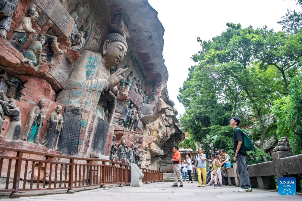 CHONGQING, 25 junio, 2025 (Xinhua) -- Imagen del 24 de junio de 2025 de personas visitando el punto escénico de los Grabados Rupestres de Dazu, en la municipalidad de Chongqing, en el suroeste de China. Los Grabados Rupestres de Dazu, un Sitio del Patrimonio Mundial de la UNESCO en la municipalidad de Chongqing, en el suroeste de China, está adquiriendo un nuevo vigor a medida que se utilizan diversas tecnologías digitales para su protección y utilización. (Xinhua/Tang Yi)