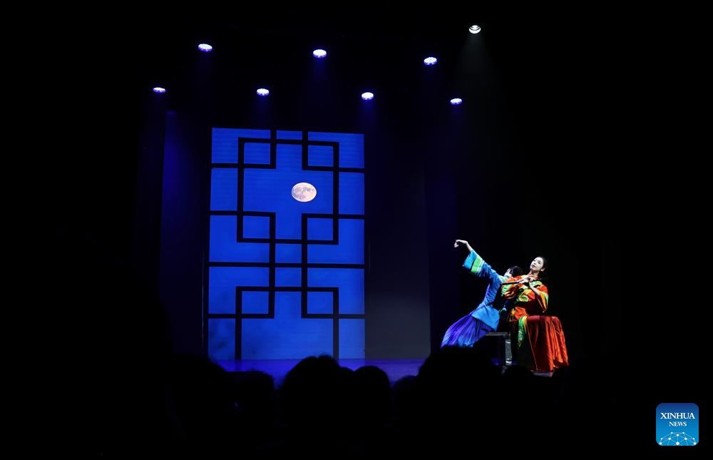 PARIS, 25 junio, 2025 (Xinhua) -- Imagen del 24 de junio de 2025 de danzantes realizando una presentación durante un espectáculo de danza tradicional china llevada a cabo en el Teatro de la Torre Eiffel, en París, Francia. (Xinhua/Gao Jing)