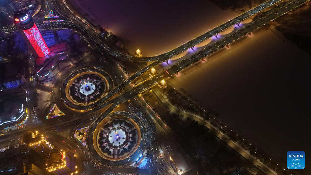 HARBIN, 26 junio, 2025 (Xinhua) -- Vista aérea tomada con un dron el 26 de enero de 2025 de un paisaje nocturno de un puente sobre el río Songhua, en Harbin, en la provincia de Heilongjiang, en el noreste de China. La ciudad, con más de 9 millones de habitantes, ahora cuenta con 16 estilos arquitectónicos diferentes: bizantino, neoclásico, art déco, barroco, y su número de edificios históricos supera los 1.000. (Xinhua/Wang Song)