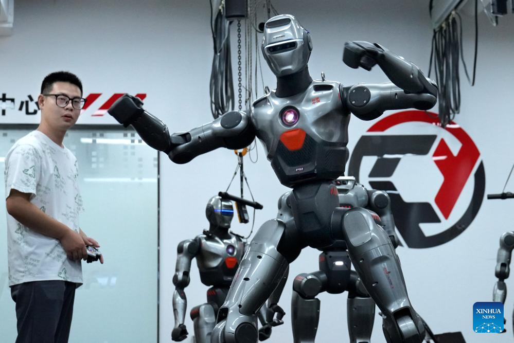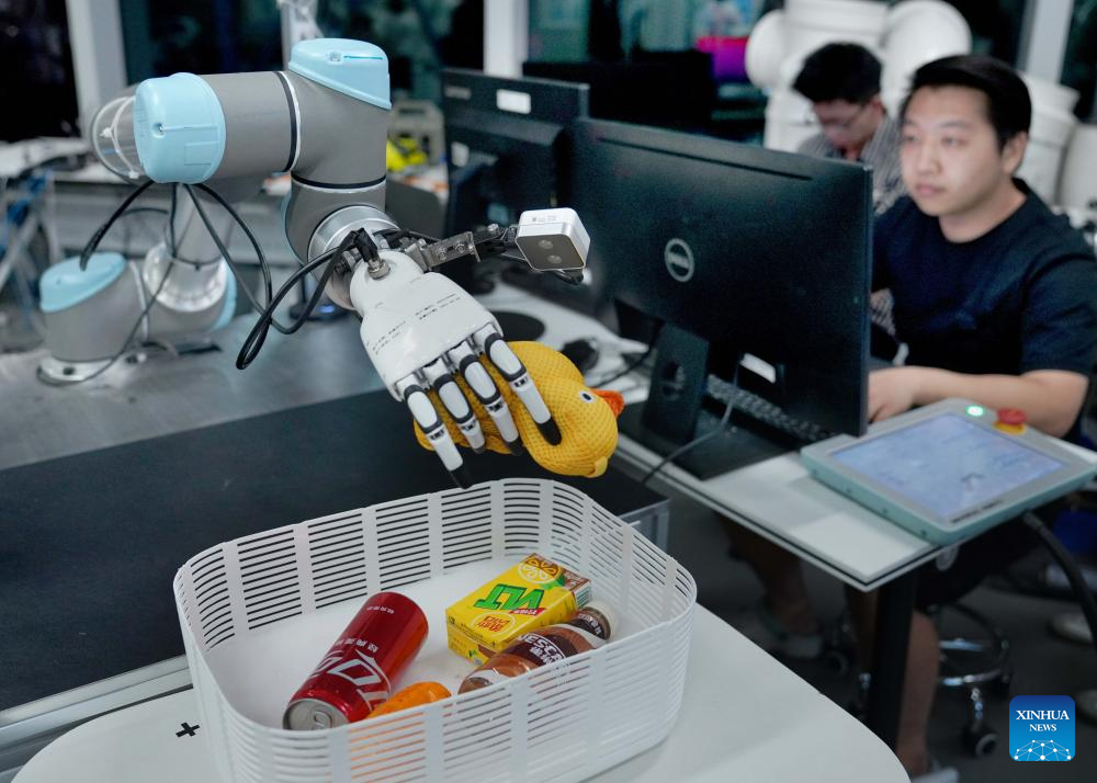 GUANGZHOU, 26 junio, 2025 (Xinhua) -- Imagen del 25 de junio de 2025 de un trabajador operando un robot para agarrar objetos en un centro provincial de innovación de robots de inteligencia artificial incorporada, en Shenzhen, en la provincia de Guangdong, en el sur de China. La producción de robots industriales de Guangdong superó las 240.000 unidades en 2024 con un aumento interanual de 31,2 por ciento, ocupando el primer lugar en el país por cinco años consecutivos, de acuerdo con el Departamento de Industria y Tecnología de la Información de la provincia de Guangdong. (Xinhua/Li An)