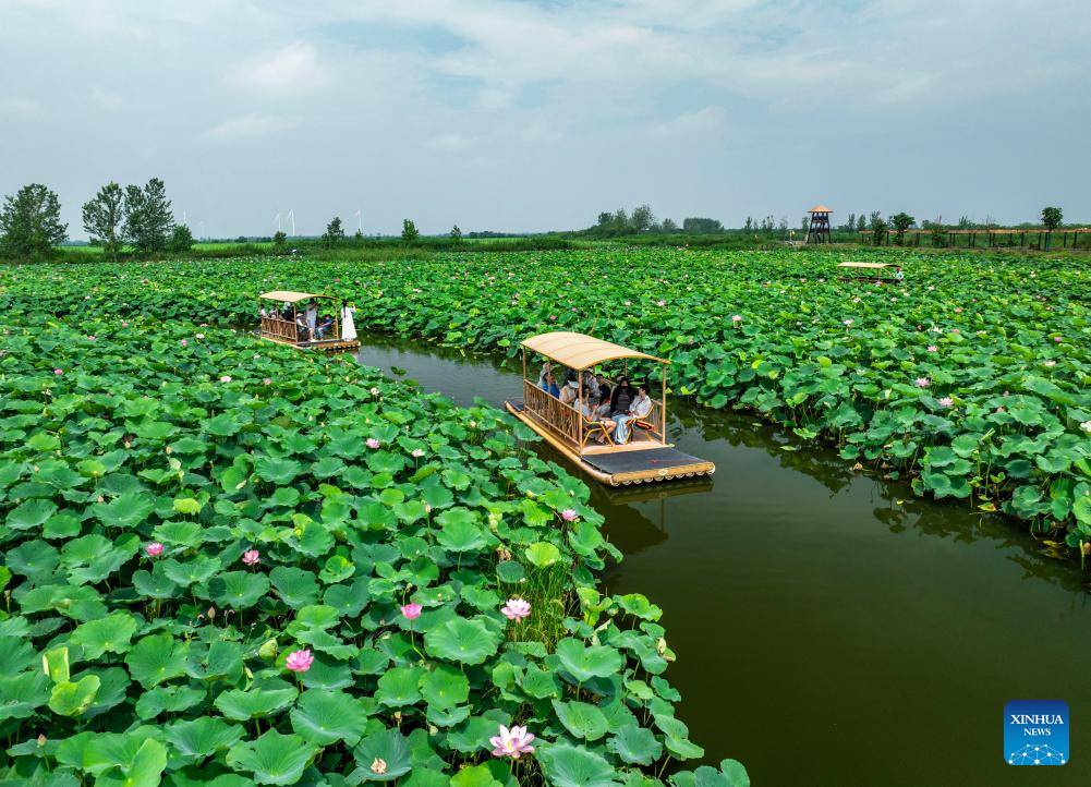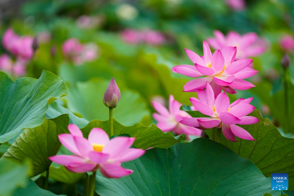 BEIJING, 28 junio, 2025 (Xinhua) -- Imagen del 28 de junio de 2025 de flores de loto en un estanque de lotos de un punto escénico, en la ciudad de Zunhua, en la provincia de Hebei, en el norte de China. (Xinhua/Liu Mancang)