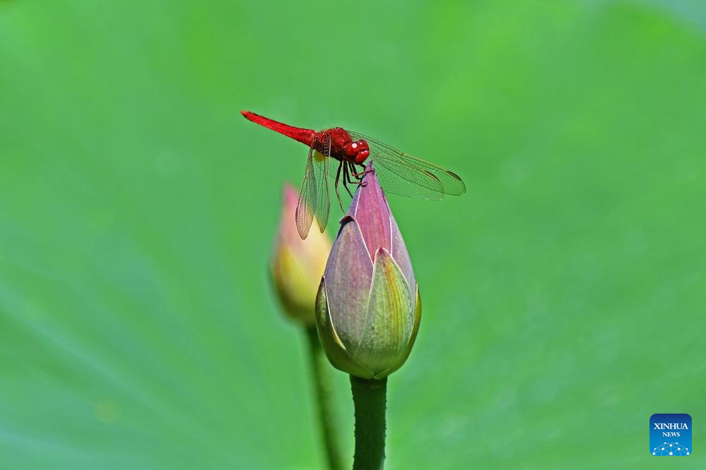 BEIJING, 28 junio, 2025 (Xinhua) -- Imagen del 25 de junio de 2025 de una libélula posándose sobre una flor de loto en un parque de humedales, en la ciudad de Yantai, en la provincia de Shandong, en el este de China. (Xinhua/Sun Wentan)