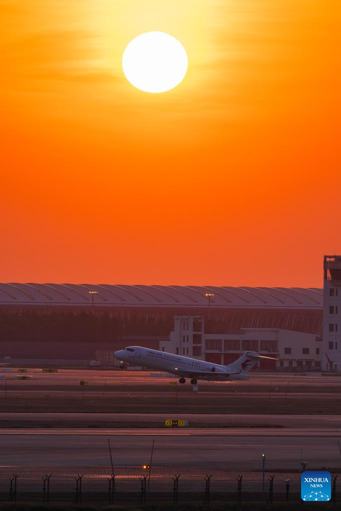 SHANGHAI, 28 junio, 2025 (Xinhua) -- Imagen del 15 de abril de 2025 de un avión de pasajeros C909 de China Eastern Airlines despegando del Aeropuerto Internacional Pudong de Shanghai, en Shanghai, en el este de China. El sábado se cumple el noveno aniversario de la operación comercial del avión de pasajeros regional C909 desarrollado por China. Hasta la fecha, se han entregado 166 aviones C909 que han realizado más de 24 millones de viajes de pasajeros. (Xinhua/Xu Bingnan)