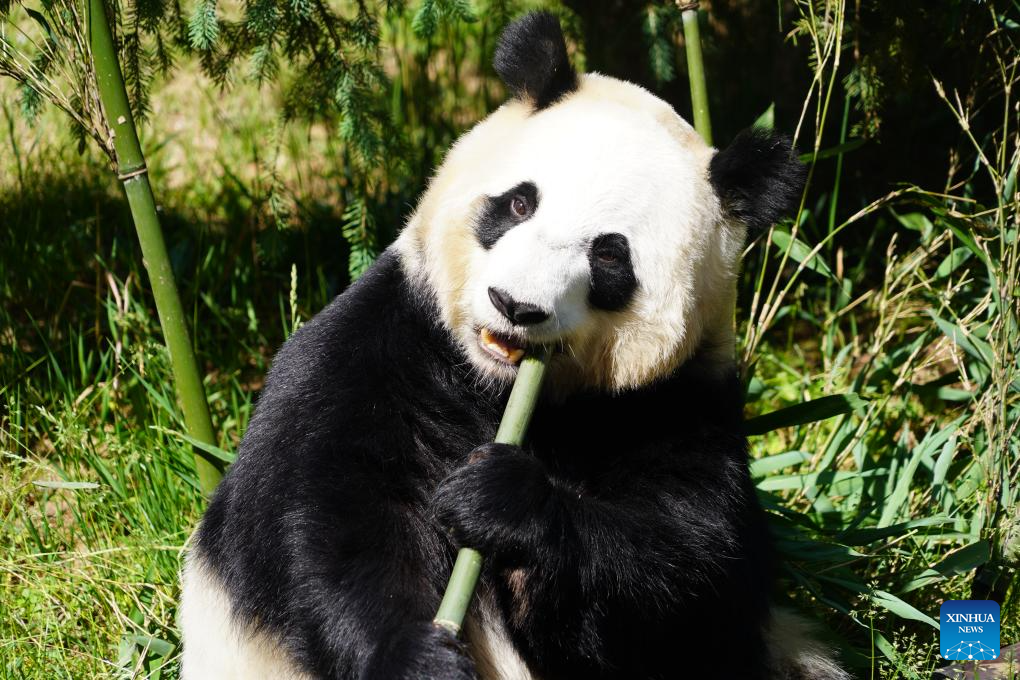 XINING, 28 junio, 2025 (Xinhua) -- La panda gigante Yuan Man come bambú en una casa de pandas, en Xining, en la provincia de Qinghai, en el noroeste de China, el 28 de junio de 2025. Las dos pandas gigantes, Qi Guo y Yuan Man, disfrutaron de la celebración de su noveno cumpleaños aquí el sábado. (Xinhua/Geng Huihuang)