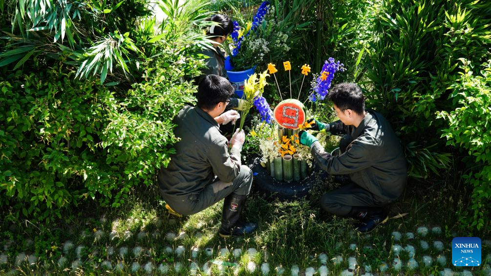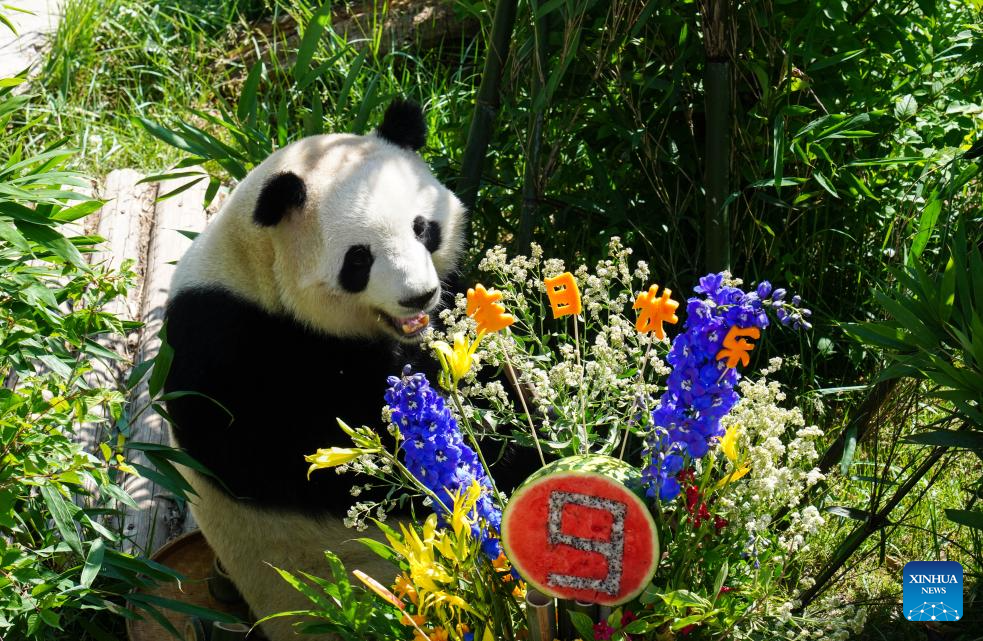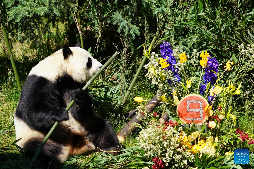 XINING, 28 junio, 2025 (Xinhua) -- Trabajadores acomodan flores para la celebración del noveno cumpleaños de las pandas gigantes Qi Guo y Yuan Man en una casa de pandas, en Xining, en la provincia de Qinghai, en el noroeste de China, el 28 de junio de 2025. Las dos pandas gigantes, Qi Guo y Yuan Man, disfrutaron de la celebración de su noveno cumpleaños aquí el sábado. (Xinhua/Wang Yan)