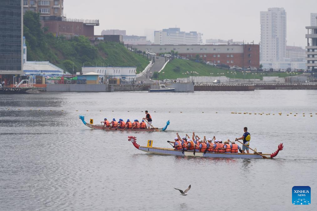 VLADIVOSTOK, 29 junio, 2025 (Xinhua) -- Equipos compiten en una carrera del bote del dragón, en Vladivostok, Rusia, el 29 de junio de 2025. Un total de 21 equipos participaron en la carrera del bote del dragón en Vladivostok el domingo. (Xinhua/Guo Feizhou)