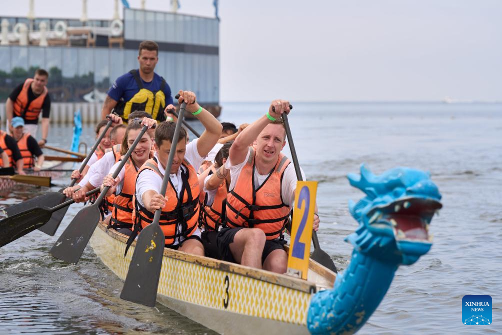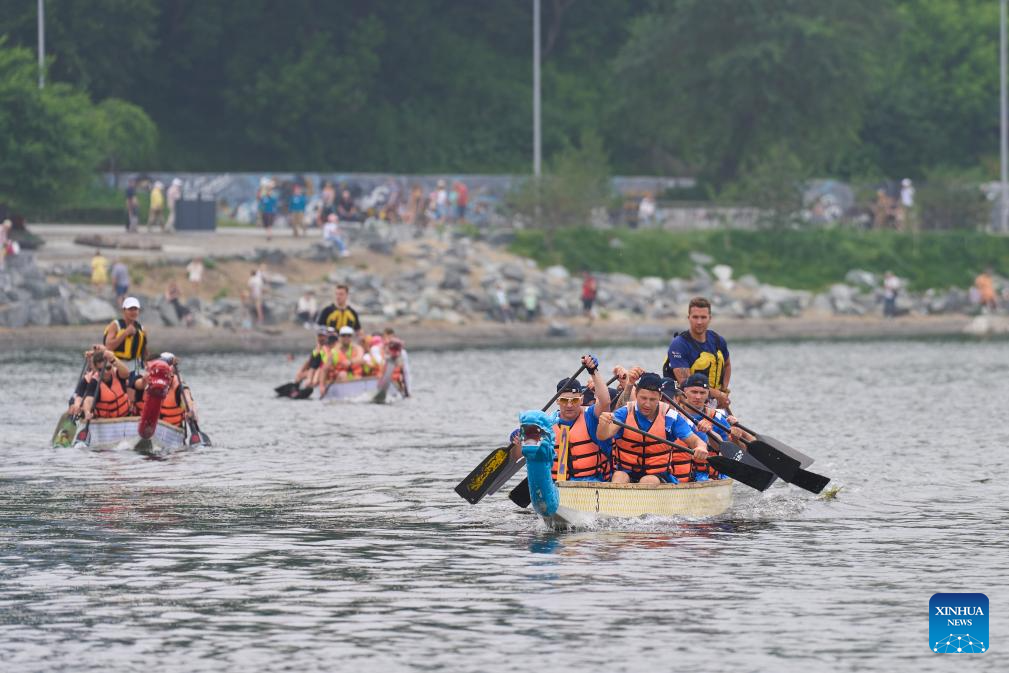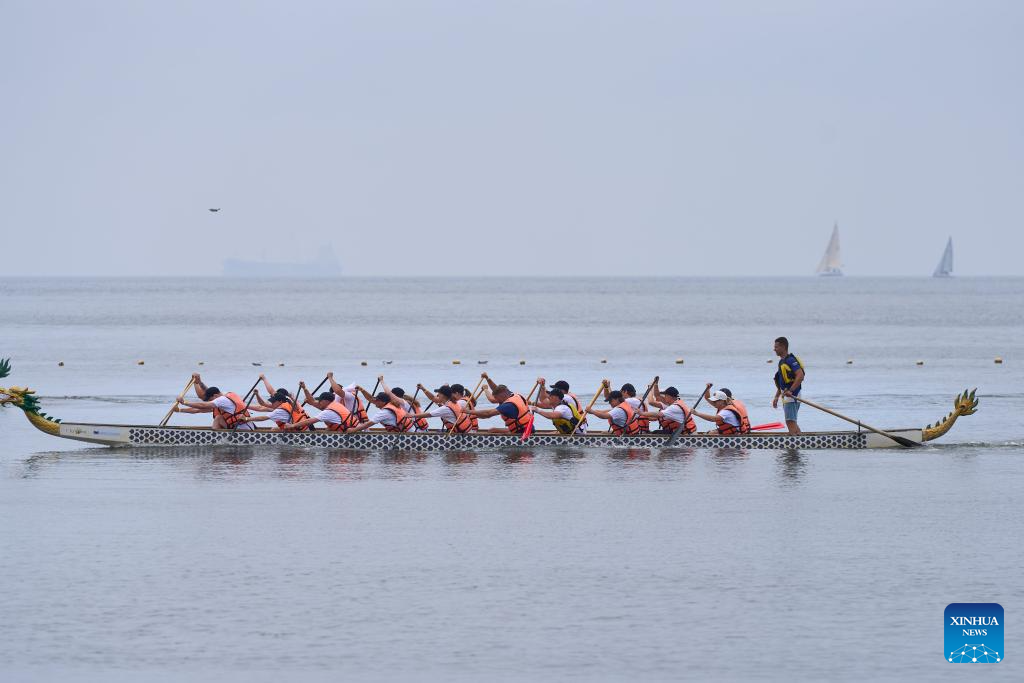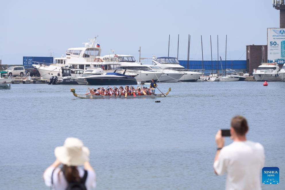 VLADIVOSTOK, 29 junio, 2025 (Xinhua) -- Personas participan en una carrera del bote del dragón, en Vladivostok, Rusia, el 29 de junio de 2025. Un total de 21 equipos participaron en la carrera del bote del dragón en Vladivostok el domingo. (Xinhua/Guo Feizhou)