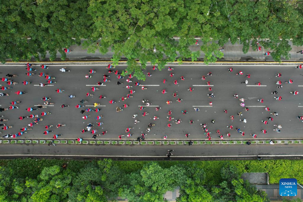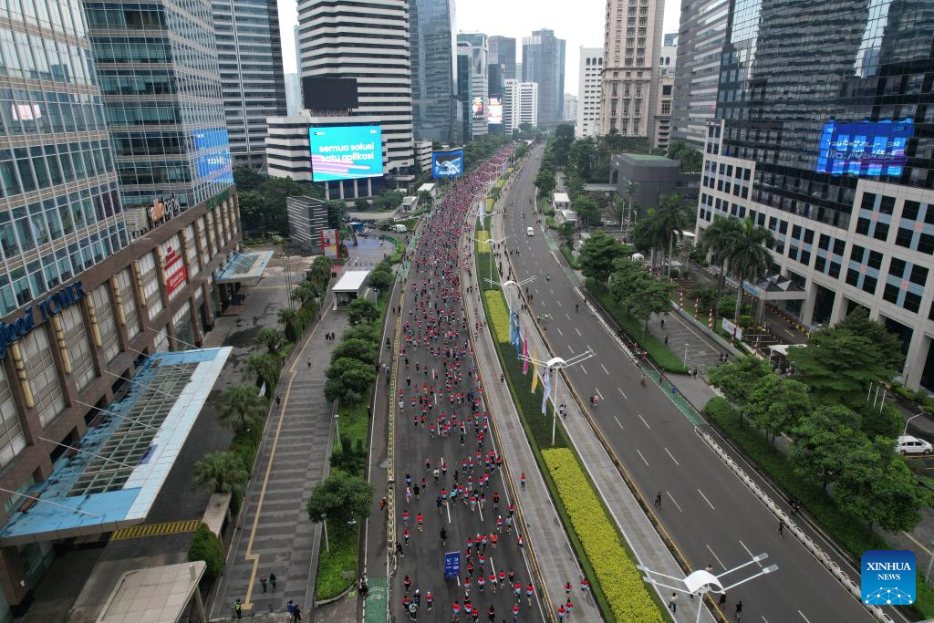 YAKARTA, 29 junio, 2025 (Xinhua) -- Imagen tomada con un dron el 29 de junio de 2025 de participantes corriendo durante el Maratón Internacional de Yakarta 2025, en Yakarta, Indonesia. (Xinhua/Veri Sanovri)