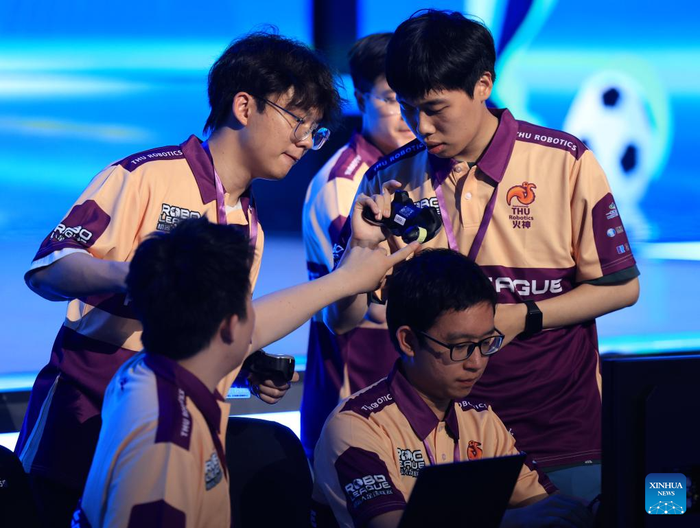 BEIJING, 29 junio, 2025 (Xinhua) -- Imagen del 28 de junio de 2025 de miembros del equipo THU Robotics de la Universidad Tsinghua preparándose para un partido de fútbol de robots impulsados por IA, en Beijing, capital de China. Un partido de fútbol robot 3 contra 3, en el que todos los jugadores eran autonómos mediante inteligencia artificial, concluyó aquí el sábado. Cuatro equipos de tres universidades chinas compitieron en el partido, y el campeón fue el equipo THU Robotics de la Universidad Tsinghua. (Xinhua/Zhang Chenlin)