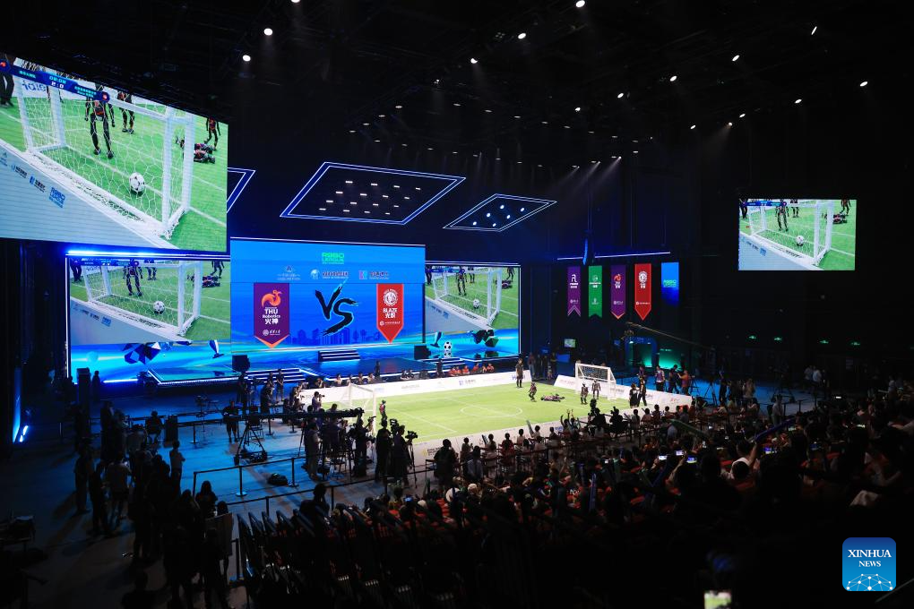 BEIJING, 29 junio, 2025 (Xinhua) -- Imagen del 28 de junio de 2025 de una escena durante un partido de fútbol de robots impulsados por IA, en Beijing, capital de China. Un partido de fútbol robot 3 contra 3, en el que todos los jugadores eran autonómos mediante inteligencia artificial, concluyó aquí el sábado. Cuatro equipos de tres universidades chinas compitieron en el partido, y el campeón fue el equipo THU Robotics de la Universidad Tsinghua. (Xinhua/Zhang Chenlin)