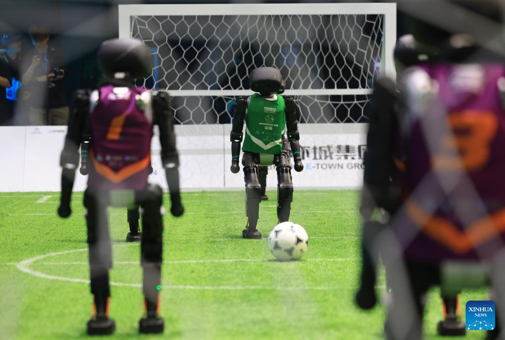 BEIJING, 29 junio, 2025 (Xinhua) -- Imagen del 28 de junio de 2025 de jugadores robots del equipo THU Robotics de la Universidad de Tsinghua compitiendo con sus contrapartes del equipo Mountain Sea de la Universidad Agrícola de China durante un partido de fútbol de robots impulsados por IA, en Beijing, capital de China. Un partido de fútbol robot 3 contra 3, en el que todos los jugadores eran autonómos mediante inteligencia artificial, concluyó aquí el sábado. Cuatro equipos de tres universidades chinas compitieron en el partido, y el campeón fue el equipo THU Robotics de la Universidad Tsinghua. (Xinhua/Zhang Chenlin)
