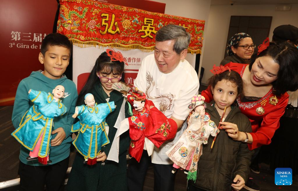Imagen del 30 de junio de 2025 de artistas enseñando a niños el uso de títeres durante la gira de "Exhibiciones sobre Cultura China en América Latina", en la Pontificia Universidad Católica del Perú, en Lima, Perú. Ciudadanos peruanos disfrutaron el lunes, en la ciudad de Lima, de la tercera edición de la gira de "Exhibiciones sobre Cultura China en América Latina", donde pudieron ver de cerca elementos del vasto patrimonio cultural del país asiático. (Xinhua/Mariana Bazo)