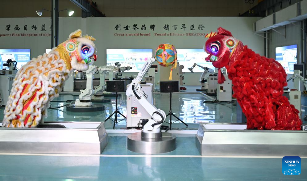 GUANGZHOU, 30 junio, 2025 (Xinhua) -- Imagen del 29 de junio de 2025 de dos robots industriales realizando una danza del león, en Greatoo Intelligent, en Jieyang, en la provincia de Guangdong, en el sur de China. La provincia de Guangdong ha estado impulsando sus ciudades clave, incluidas Guangzhou, Shenzhen, Foshan y Dongguan, para que participen en la fabricación de equipos inteligentes, en un esfuerzo por construir un clúster industrial para la fabricación de equipos de alta gama. (Xinhua/Deng Hua)