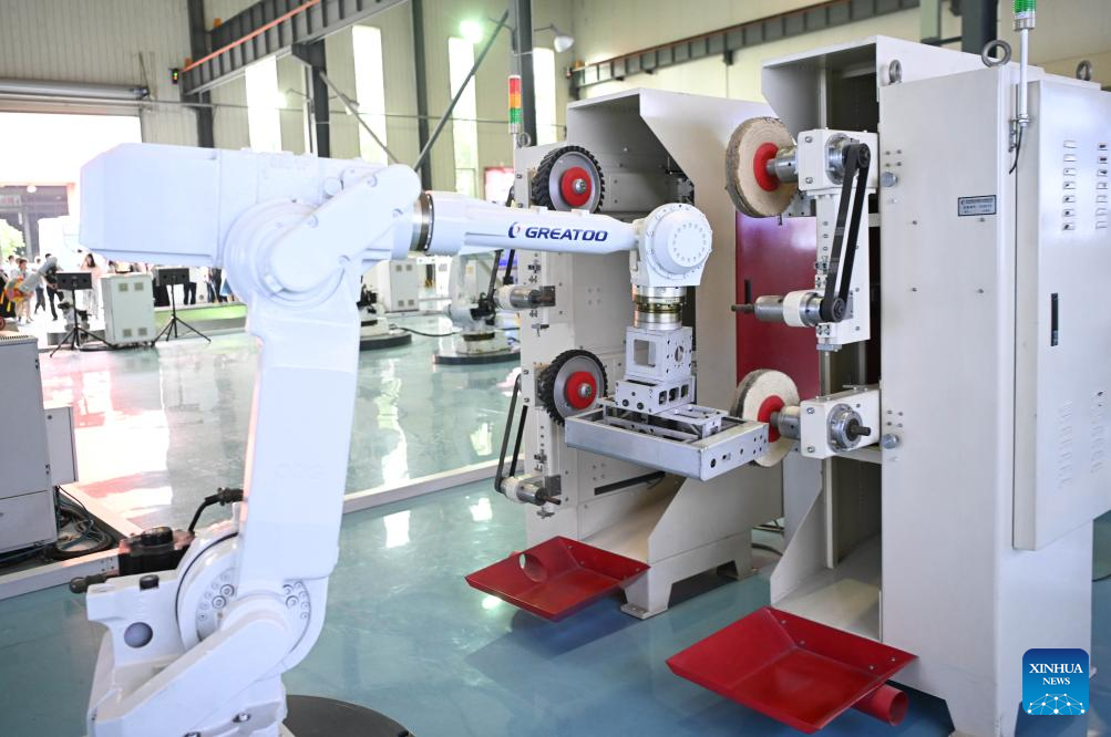 GUANGZHOU, 30 junio, 2025 (Xinhua) -- Imagen del 29 de junio de 2025 de un brazo robótico rectificando una unidad en Greatoo Intelligent, en Jieyang, en la provincia de Guangdong, en el sur de China. La provincia de Guangdong ha estado impulsando sus ciudades clave, incluidas Guangzhou, Shenzhen, Foshan y Dongguan, para que participen en la fabricación de equipos inteligentes, en un esfuerzo por construir un clúster industrial para la fabricación de equipos de alta gama. (Xinhua/Deng Hua)