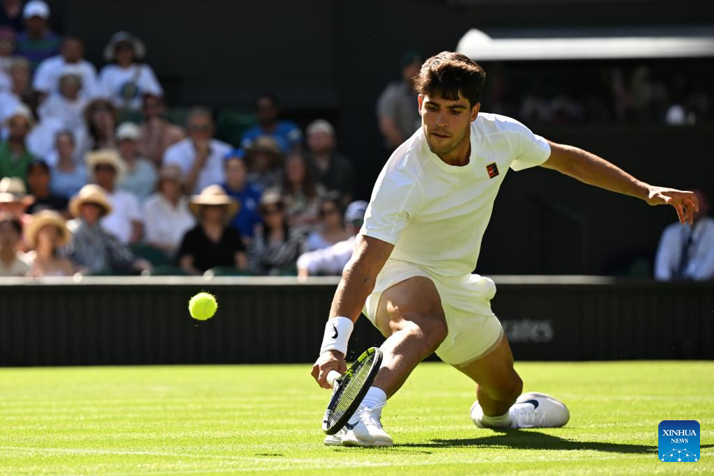 LONDRES, 1 julio, 2025 (Xinhua) -- Imagen del 30 de junio de 2025 de Carlos Alcaraz devolviendo la pelota durante el partido de primera ronda de individuales masculinos entre Carlos Alcaraz, de España, y Fabio Fognini, de Italia, en el Campeonato de Tenis de Wimbledon, en Londres, Reino Unido. (Xinhua/Zhao Dingzhe)