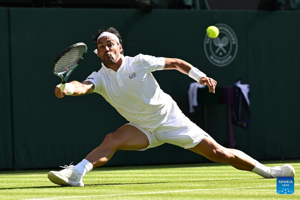LONDRES, 1 julio, 2025 (Xinhua) -- Imagen del 30 de junio de 2025 de Fabio Fognini sirviendo la pelota durante el partido de primera ronda de individuales masculinos entre Carlos Alcaraz, de España, y Fabio Fognini, de Italia, en el Campeonato de Tenis de Wimbledon, en Londres, Reino Unido. (Xinhua/Zhao Dingzhe)
