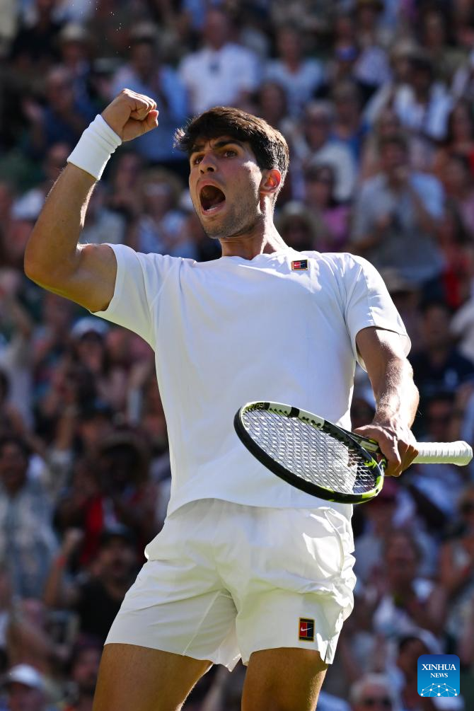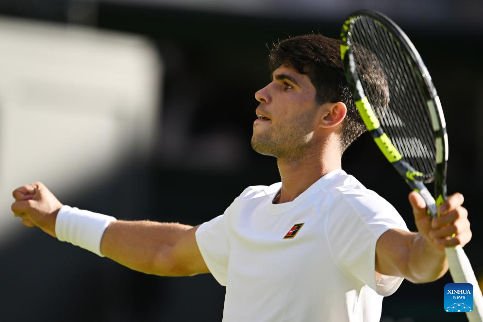 LONDRES, 1 julio, 2025 (Xinhua) -- Imagen del 30 de junio de 2025 de Carlos Alcaraz reaccionando al término del partido de primera ronda de individuales masculinos entre Carlos Alcaraz, de España, y Fabio Fognini, de Italia, en el Campeonato de Tenis de Wimbledon, en Londres, Reino Unido. (Xinhua/Zhao Dingzhe)