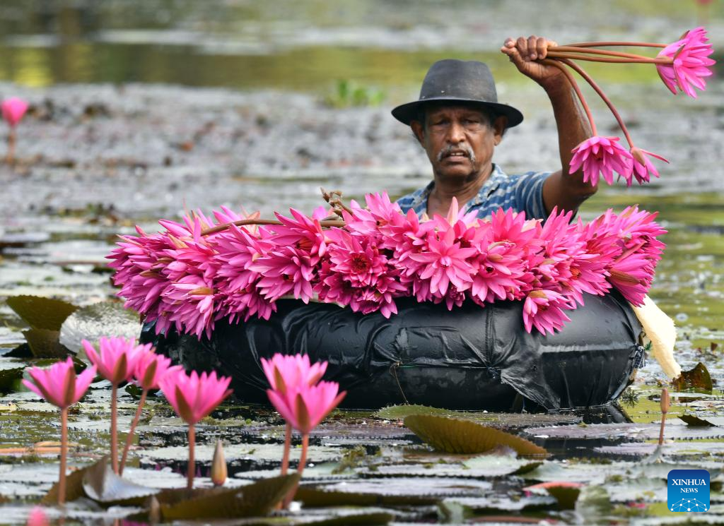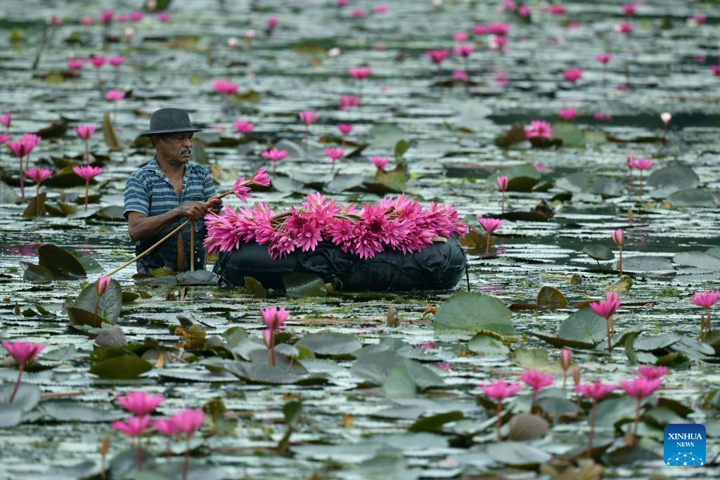 COLOMBO, 1 julio, 2025 (Xinhua) -- Un hombre recolecta lirios de agua rosados de un lago, en Hokandara, un suburbio de Colombo, Sri Lanka, el 1 de julio de 2025. (Xinhua/Ajith Perera)