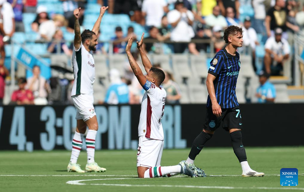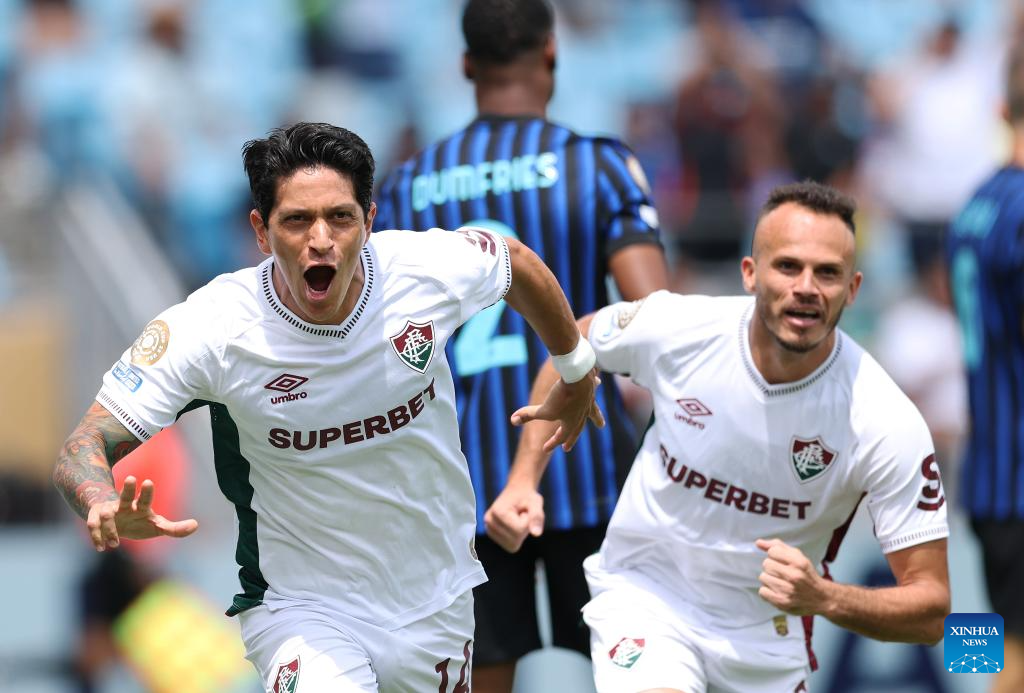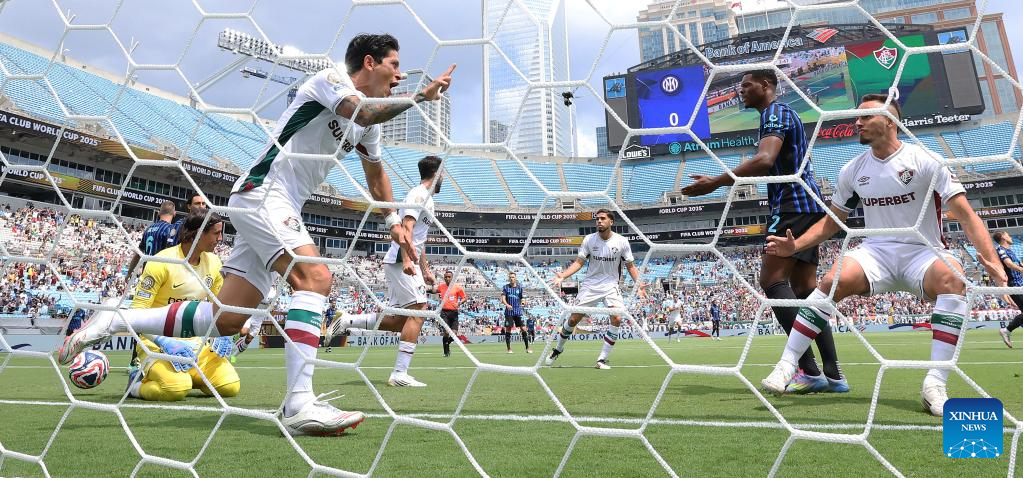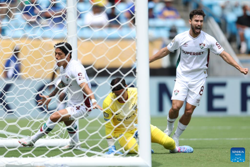 CHARLOTTE, 1 julio, 2025 (Xinhua) -- Imagen del 30 de junio de 2025 de Germán Cano (i), de Fluminense FC, festejando una anotación durante el partido de octavos de final entre FC Inter Milan, de Italia, y Fluminense FC, de Brasil, en la Copa Mundial de Clubes de la FIFA 2025, en el Bank of America Stadium, en Charlotte, Carolina del Norte, Estados Unidos. (Xinhua/Li Ming)