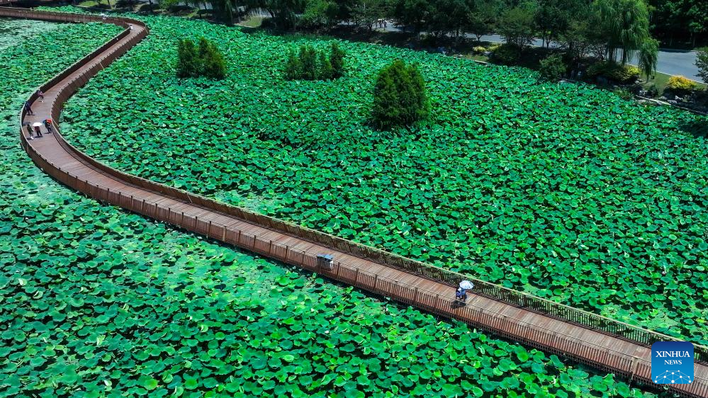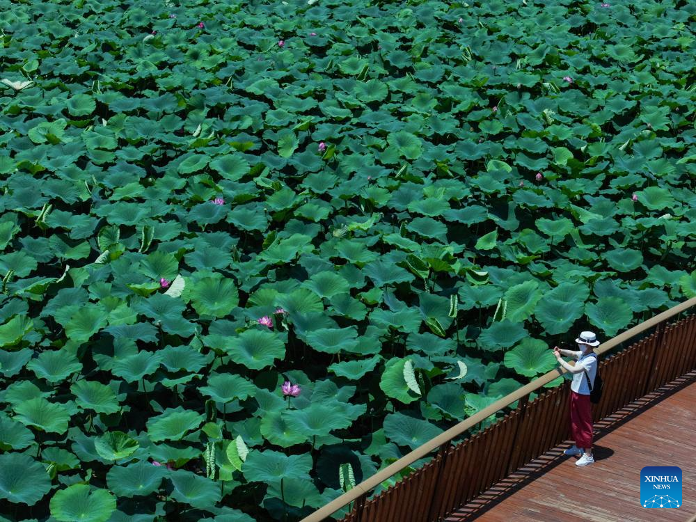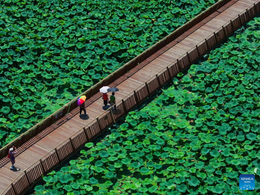 NANJING, 1 julio, 2025 (Xinhua) -- Imagen tomada con un dron el 1 de julio de 2025 de un turista tomando fotografías de flores de loto en un camino de tablones en el Parque del Lago Xuanwu, en Nanjing, en la provincia de Jiangsu, en el este de China. (Xinhua/Li Bo)