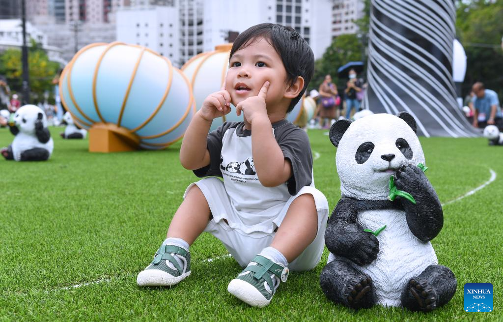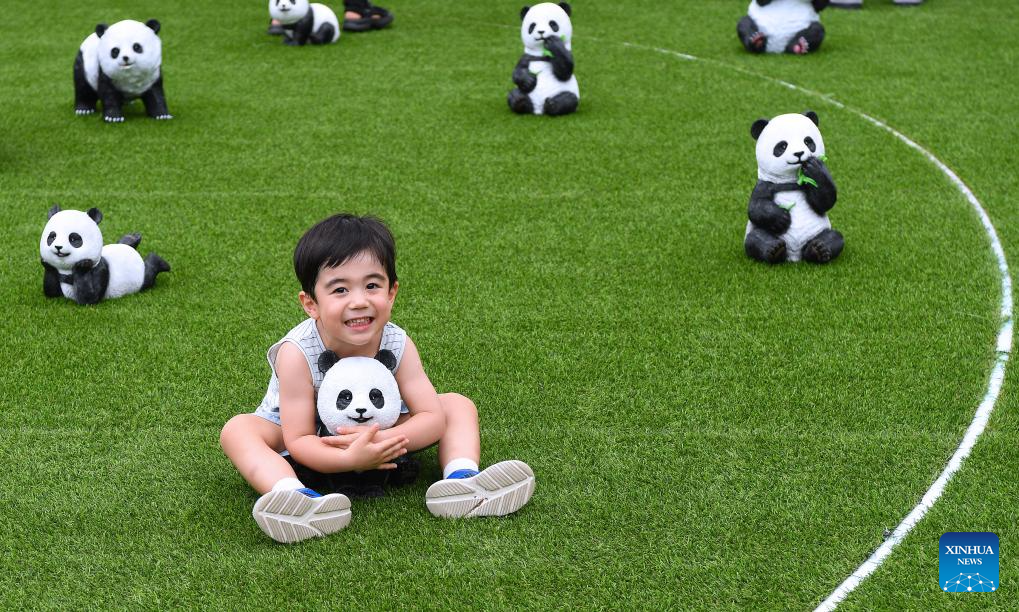 HONG KONG, 1 julio, 2025 (Xinhua) -- Un niño posa para fotografías con decoraciones de panda en un evento de celebración llevado a cabo en el Parque Victoria, en Hong Kong, en el sur de China, el 1 de julio de 2025. Celebraciones se llevaron a cabo aquí el martes para conmemorar el 28 aniversario del retorno de Hong Kong a la patria. (Xinhua/Chen Duo)