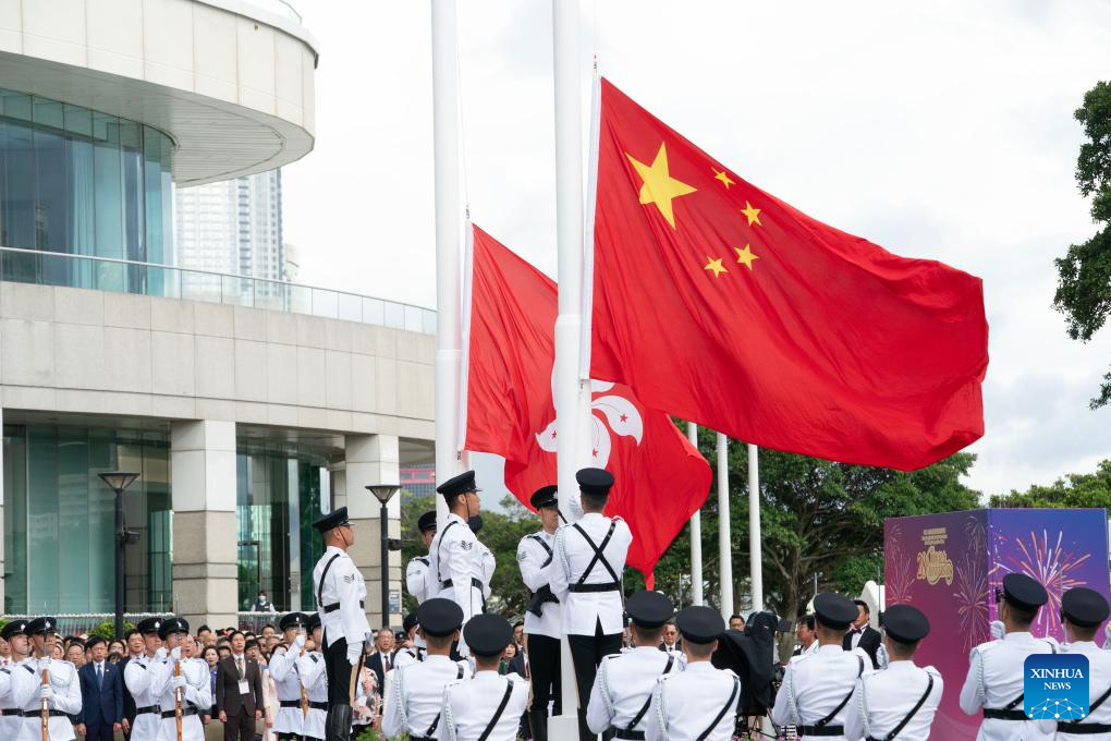 HONG KONG, 1 julio, 2025 (Xinhua) -- Una ceremonia de izamiento de la bandera se lleva a cabo por el gobierno de la Región Administrativa Especial de Hong Kong para celebrar el 28 aniversario del retorno de Hong Kong a la patria, en la Plaza de la Bauhinia Dorada, en Hong Kong, en el sur de China, el 1 de julio de 2025. (Xinhua/Lui Siu Wai)