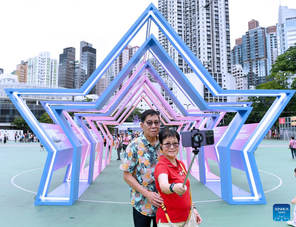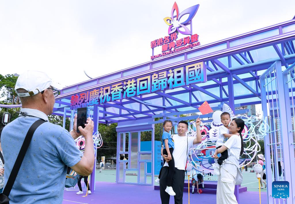 HONG KONG, 1 julio, 2025 (Xinhua) -- Ciudadanos posan para fotografías en un evento de celebración llevado a cabo en el Parque Victoria, en Hong Kong, en el sur de China, el 1 de julio de 2025. Celebraciones se llevaron a cabo aquí el martes para conmemorar el 28 aniversario del retorno de Hong Kong a la patria. (Xinhua/Chen Duo)