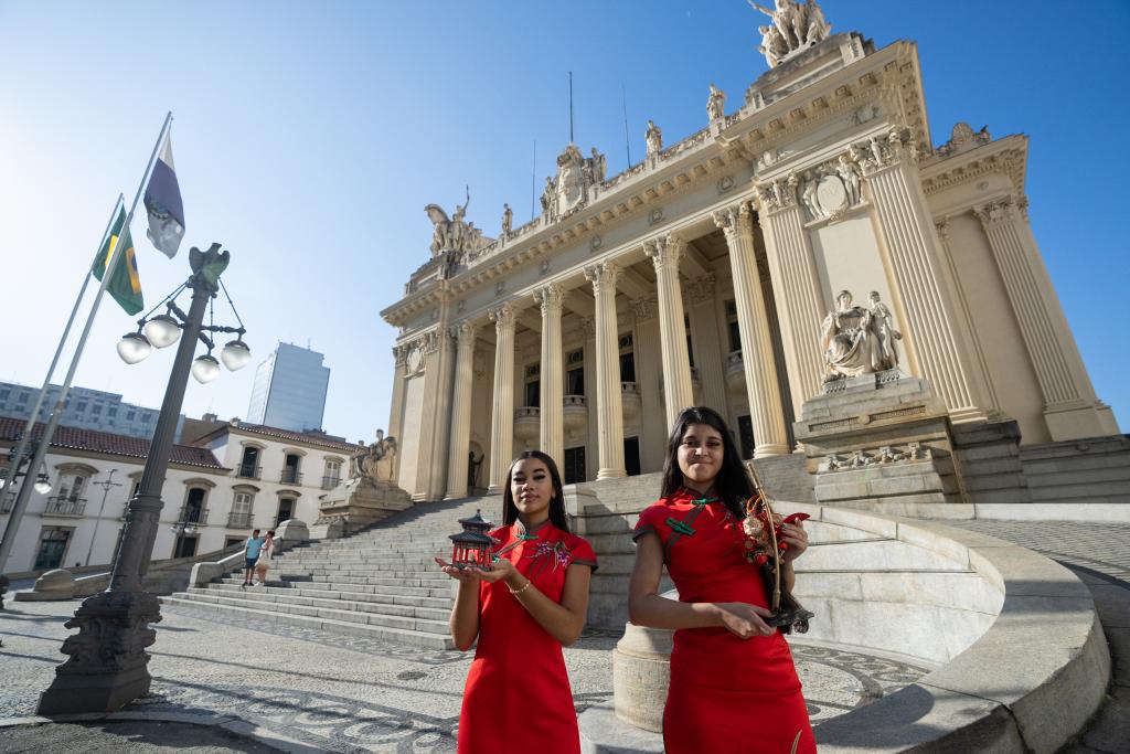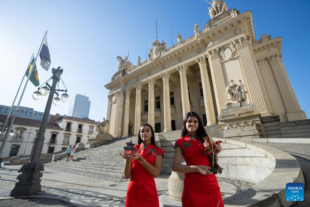 RIO DE JANEIRO, 1 julio, 2025 (Xinhua) -- Imagen del 30 de junio de 2025 de voluntarias portando atuendos tradicionales chinos exhibiendo artesanías con elementos chinos durante una exposición de innovación en artesanía tradicional de la ciudad de Hangzhou, en el este de China, en el Palacio Tiradentes, en Río de Janeiro, Brasil. El evento mostró una variedad de artesanías tradicionales chinas y sus expresiones innovadoras al público brasileño mediante demostraciones y experiencias interactivas. (Xinhua/Wang Tiancong)