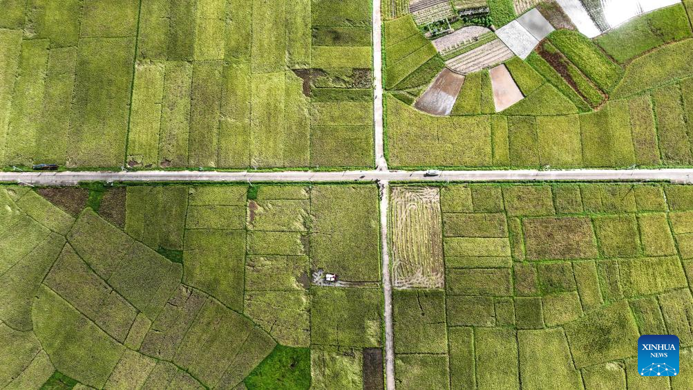 QINZHOU, 2 julio, 2025 (Xinhua) -- Vista aérea del 2 de julio de 2025 de los campos de arroz, en el poblado de Kangxiling de la ciudad de Qinzhou, en la región autónoma de la etnia zhuang de Guangxi, en sur de China. La cosecha temprana de arroz está en pleno apogeo aquí. (Xinhua/Zhang Ailin)