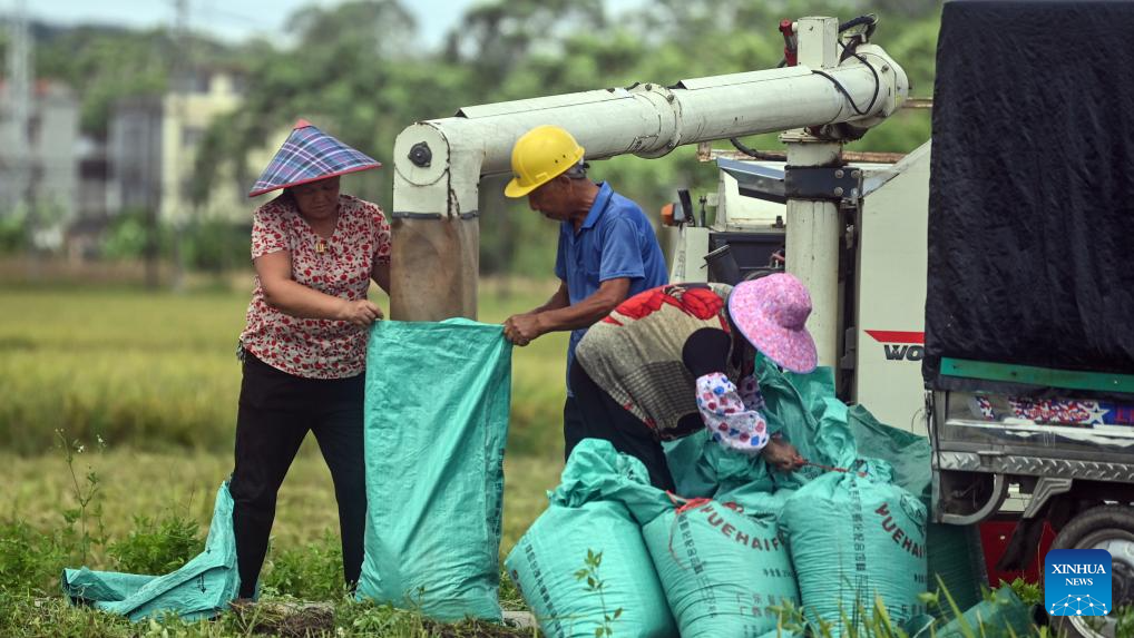 QINZHOU, 2 julio, 2025 (Xinhua) -- Agricultores empacan arroz cosechado, en la aldea de Banping, en el poblado de Kangxiling de la ciudad de Qinzhou, en la región autónoma de la etnia zhuang de Guangxi, en sur de China, el 2 de julio de 2025. La cosecha temprana de arroz está en pleno apogeo aquí. (Xinhua/Zhang Ailin)