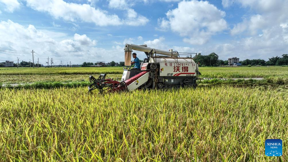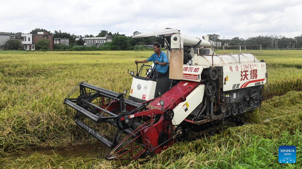 QINZHOU, 2 julio, 2025 (Xinhua) -- Un agricultor conduce una cosechadora para recolectar arroz, en la aldea de Banping, en el poblado de Kangxiling de la ciudad de Qinzhou, en la región autónoma de la etnia zhuang de Guangxi, en sur de China, el 2 de julio de 2025. La cosecha temprana de arroz está en pleno apogeo aquí. (Xinhua/Zhang Ailin)