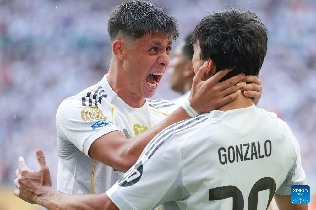 MIAMI, 2 julio, 2025 (Xinhua) -- Imagen del 1 de julio de 2025 de Arda Güler (i), y Gonzalo García, de Real Madrid, festejando una anotación durante el partido de octavos de final entre Real Madrid, de España, y Juventus FC, de Italia, en la Copa Mundial de Clubes de la FIFA 2025, en el Hard Rock Stadium, en Miami, Florida, Estados Unidos. (Xinhua/Xu Chang)