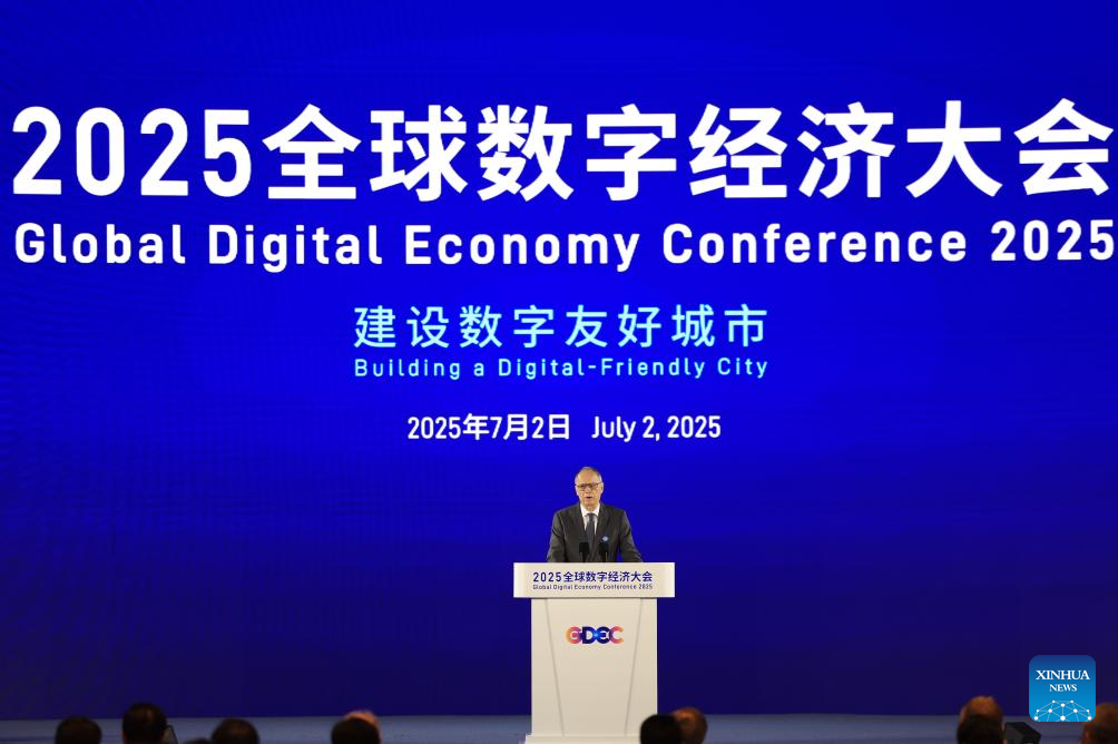 BEIJING, 2 julio, 2025 (Xinhua) -- Imagen del 2 de julio de 2025 de la ceremonia de inauguración de la Conferencia Global de Economía Digital 2025, en Beijing, capital de China. Con el tema de "Construyendo una ciudad digitalmente amigable", la Conferencia Global de Economía Digital 2025 se inauguró aquí el miércoles. (Xinhua/Zhang Chenlin)