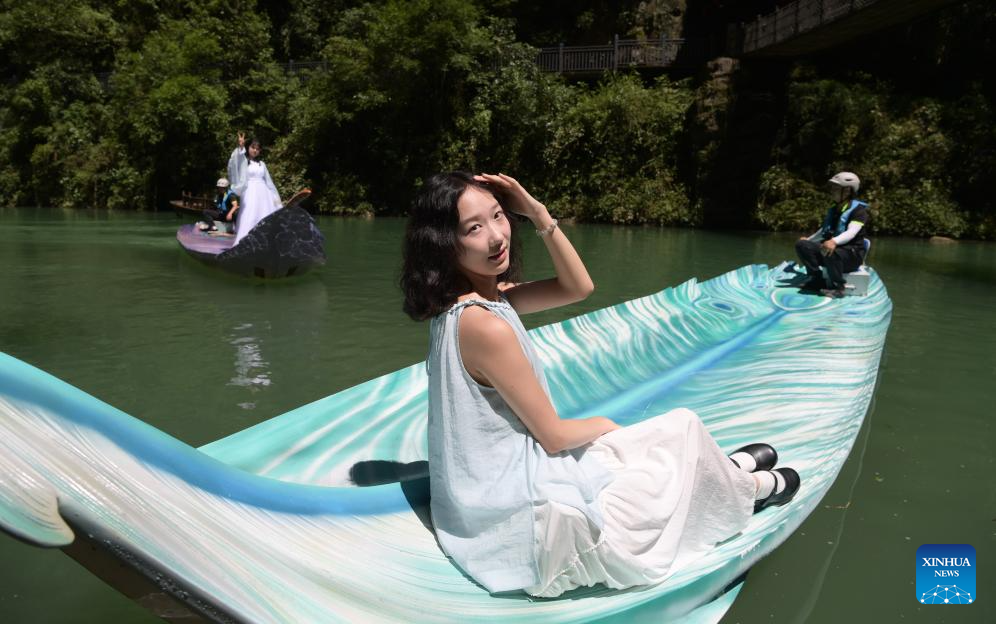HEFENG, 4 julio, 2025 (Xinhua) -- Imagen del 3 de julio de turistas tomando botes con forma de pluma en el punto escénico de Pingshan, en el distrito de Hefeng, en la prefectura autónoma tujia y miao de Enshi, en la provincia de Hubei, en el centro de China. (Xinhua/Yang Shunpi)