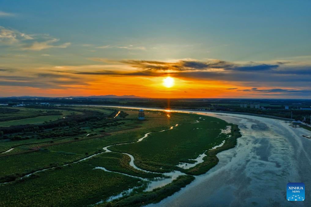 BEIJING, 4 julio, 2025 (Xinhua) -- Vista aérea tomada con un dron el 4 de julio de 2025 del sol saliendo en el área de turismo ecológico de Sanjiangkou, en la ciudad de Tongjiang, en la provincia de Heilongjiang, en el noreste de China. La Tierra pasó el afelio el 4 de julio, que es el momento del año cuando la Tierra está más lejos del Sol, y su diámetro aparente es el más pequeño en el año. (Xinhua/Liu Wanping)