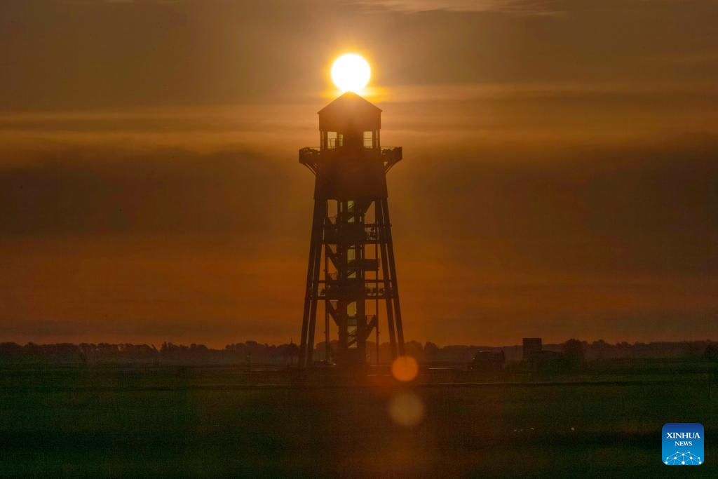 BEIJING, 4 julio, 2025 (Xinhua) -- Imagen del 4 de julio de 2025 del sol saliendo en la ciudad de Jiamusi, en la provincia de Heilongjiang, en el noreste de China. La Tierra pasó el afelio el 4 de julio, que es el momento del año cuando la Tierra está más lejos del Sol, y su diámetro aparente es el más pequeño en el año. (Xinhua/Qu Yubao)
