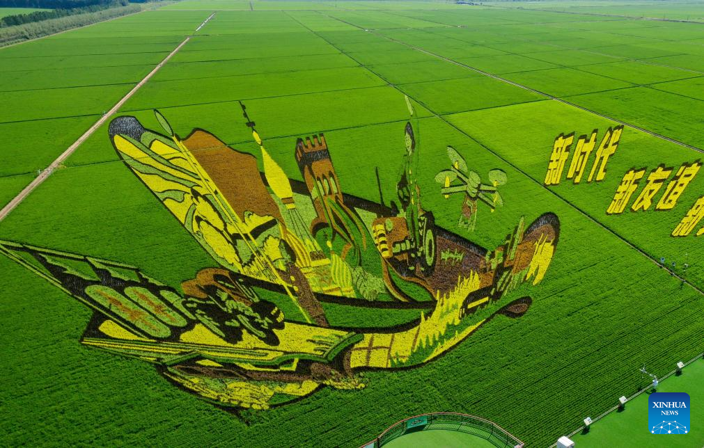 FUJIN, 5 julio, 2025 (Xinhua) -- Vista aérea tomada con un dron el 3 de julio de 2025 de un parque de campo de arroz, en la ciudad de Fujin, en la provincia de Heilongjiang, en el noreste de China. En la actualidad, en las áreas productoras de arroz de la provincia de Heilongjiang, diversas imágenes magníficas de campos de arroz "dibujadas" por diferentes variedades de arroz se despliegan sobre la vasta tierra negra. (Xinhua/Qu Yubao)