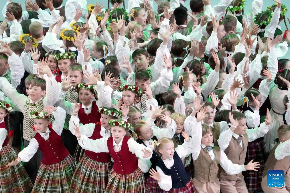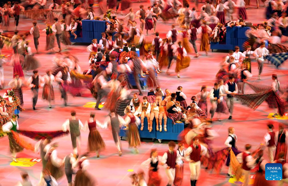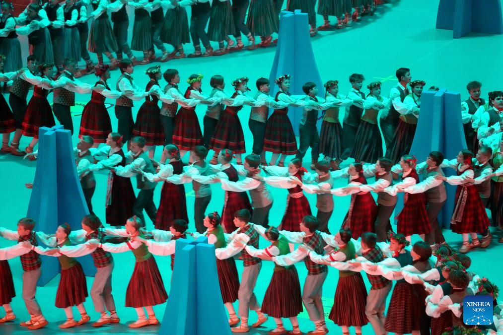 RIGA, 6 julio, 2025 (Xinhua) -- Imagen del 5 de julio de 2025 de participantes realizando una presentación durante el XIII Festival Escolar Juvenil de Canto y Danza de Letonia, en Riga, Letonia. El festival, que se lleva a cabo cada cinco años, es uno de los mayores eventos artísticos y culturales para niños y jóvenes en el país. (Xinhua/Edijs Palens)