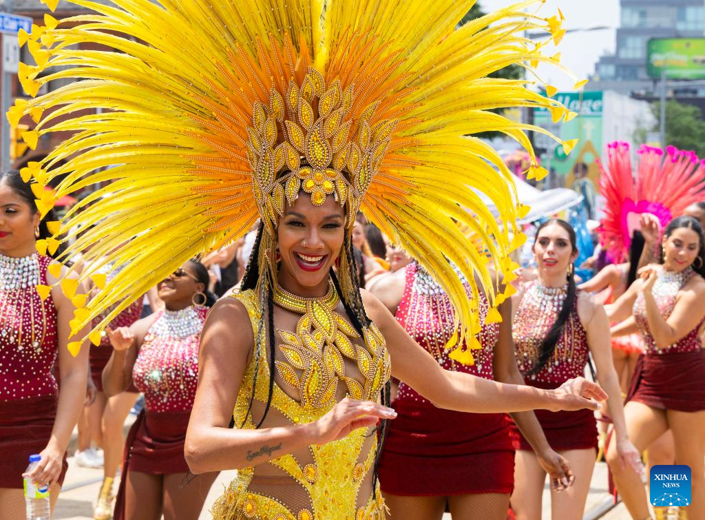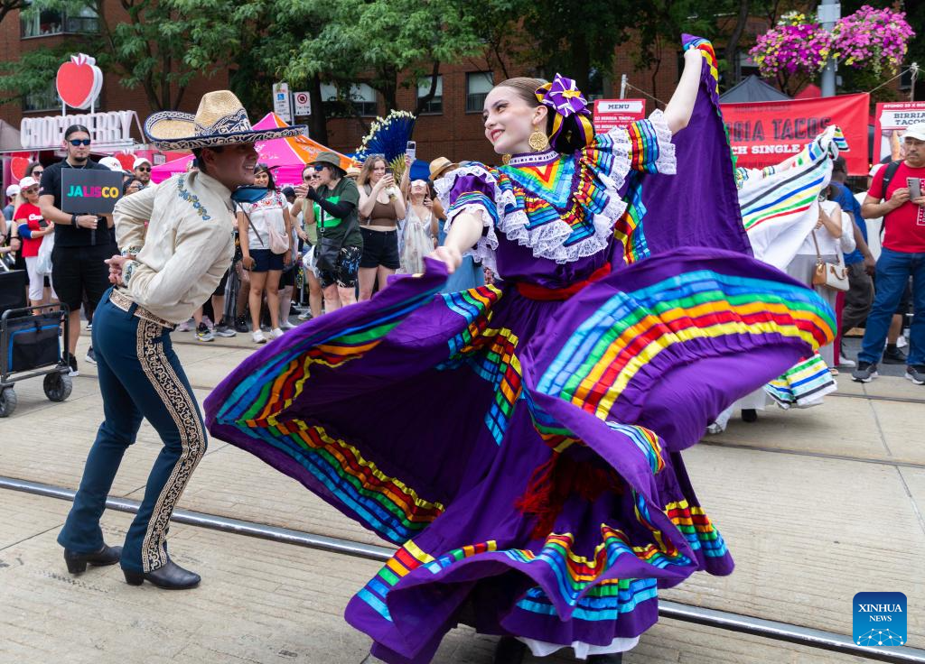 TORONTO, 6 julio, 2025 (Xinhua) -- Imagen del 5 de julio de 2025 de bailarines portando trajes tradicionales mientras participan en el Festival de Salsa en la Calle St. Clair 2025, en Toronto, Canadá. Como una de las mayores celebraciones culturales de temática latina en Canadá, el festival anual de dos días comenzó aquí el sábado. (Xinhua/Zou Zheng)