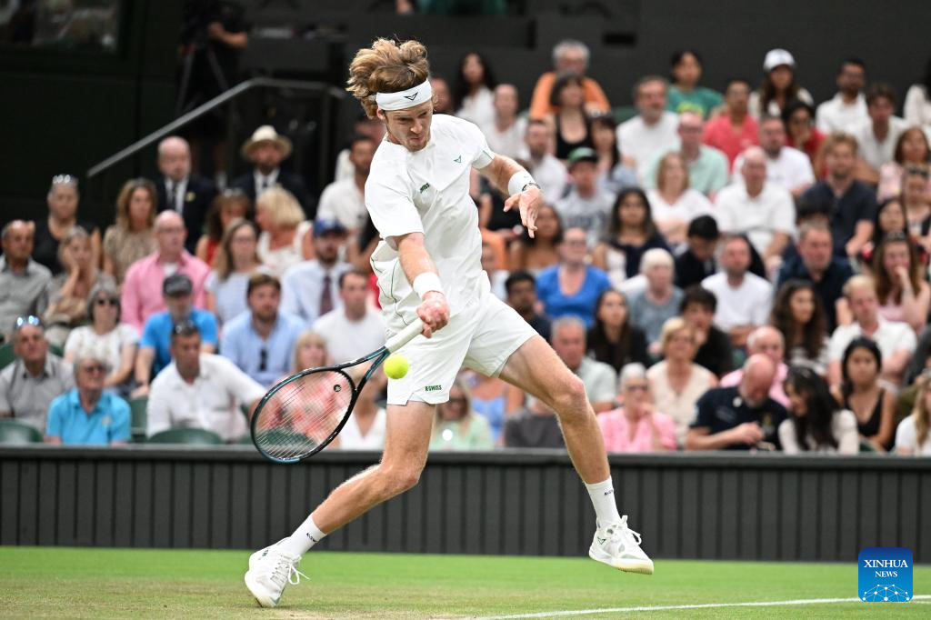 LONDRES, 7 julio, 2025 (Xinhua) -- Imagen del 6 de julio de 2025 de Andrey Rublev devolviendo la pelota durante el partido de cuarta ronda de individuales masculinos entre Carlos Alcaraz, de España, y Andrey Rublev, de Rusia, en el Campeonato de Tenis de Wimbledon, en Londres, Reino Unido. (Xinhua/Zhao Dingzhe)