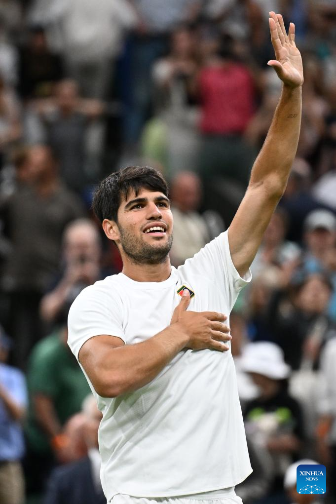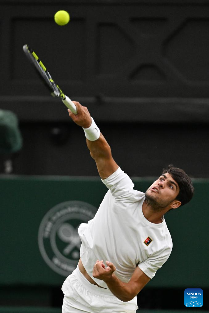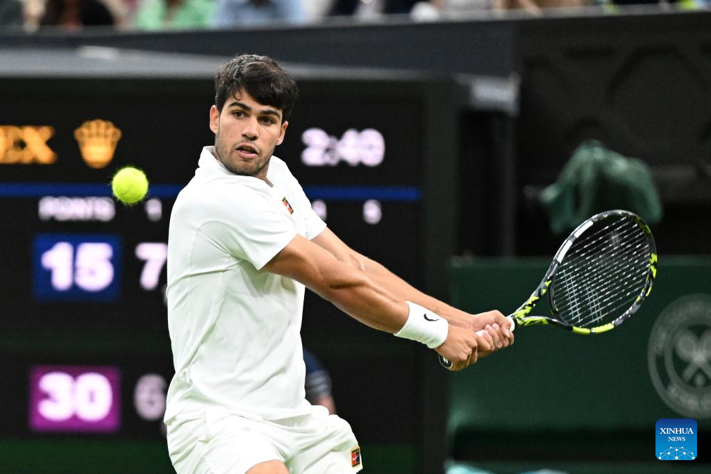 LONDRES, 7 julio, 2025 (Xinhua) -- Imagen del 6 de julio de 2025 de Carlos Alcaraz devolviendo la pelota durante el partido de cuarta ronda de individuales masculinos entre Carlos Alcaraz, de España, y Andrey Rublev, de Rusia, en el Campeonato de Tenis de Wimbledon, en Londres, Reino Unido. (Xinhua/Zhao Dingzhe)