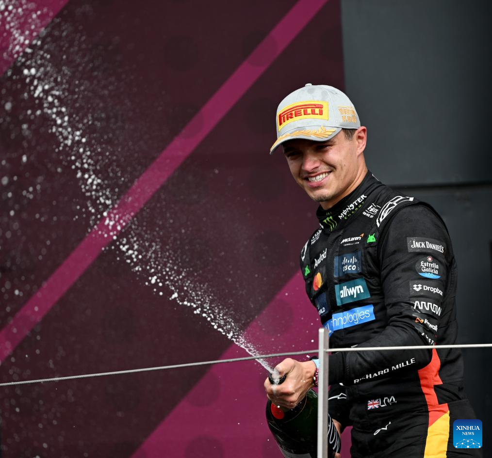 LONDRES, 7 julio, 2025 (Xinhua) -- Imagen del 6 de julio de 2025 del piloto británico de la escudería McLaren, Lando Norris, festejando durante la ceremonia de premiación del Gran Premio de Reino Unido de Fórmula Uno 2025, en el Circuito de Silverstone, en Londres, Reino Unido. (Xinhua/Li Ying)