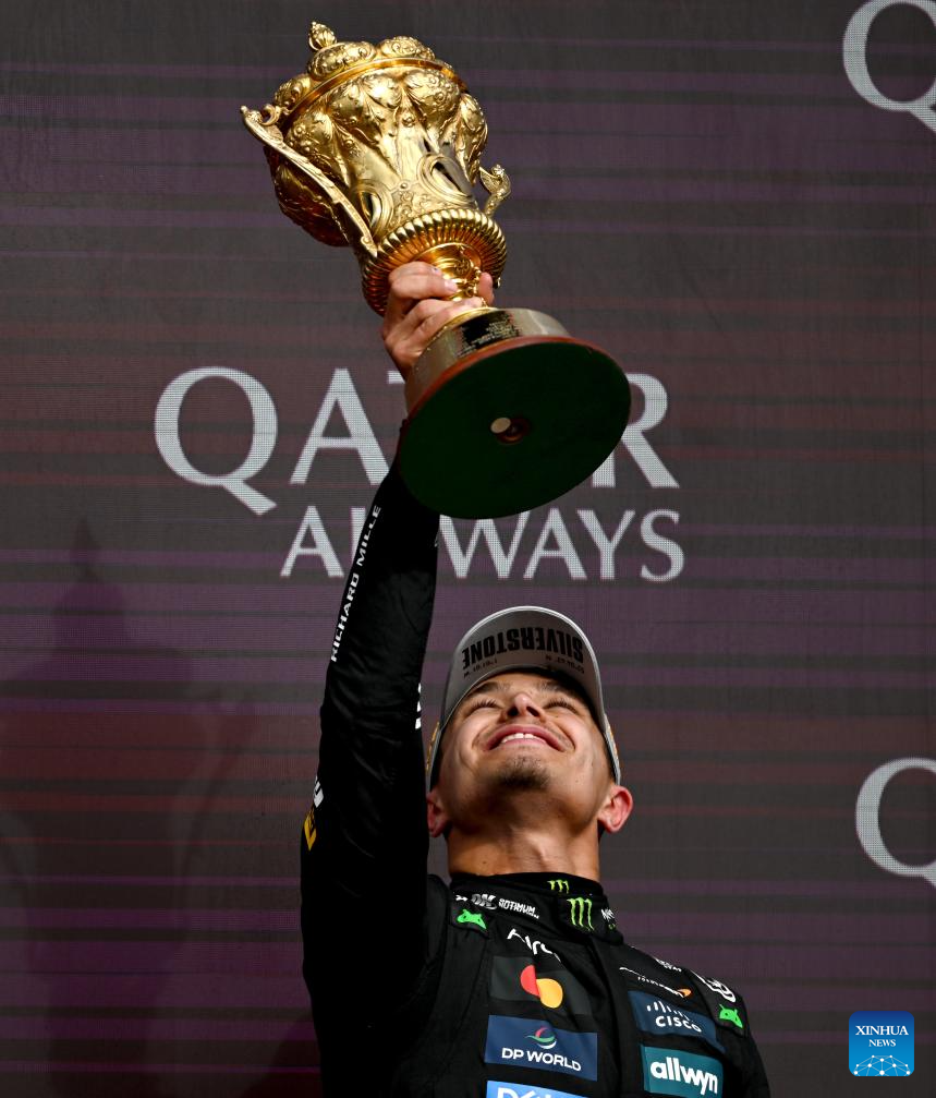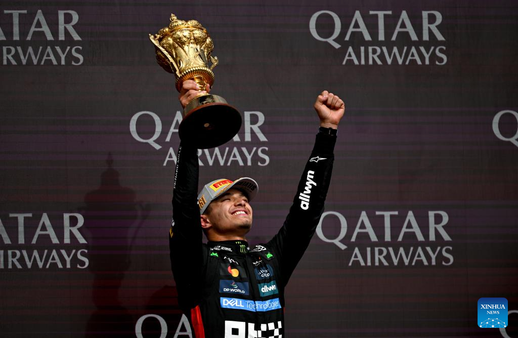 LONDRES, 7 julio, 2025 (Xinhua) -- Imagen del 6 de julio de 2025 del piloto británico de la escudería McLaren, Lando Norris, festejando con su trofeo durante la ceremonia de premiación del Gran Premio de Reino Unido de Fórmula Uno 2025, en el Circuito de Silverstone, en Londres, Reino Unido. (Xinhua/Li Ying)