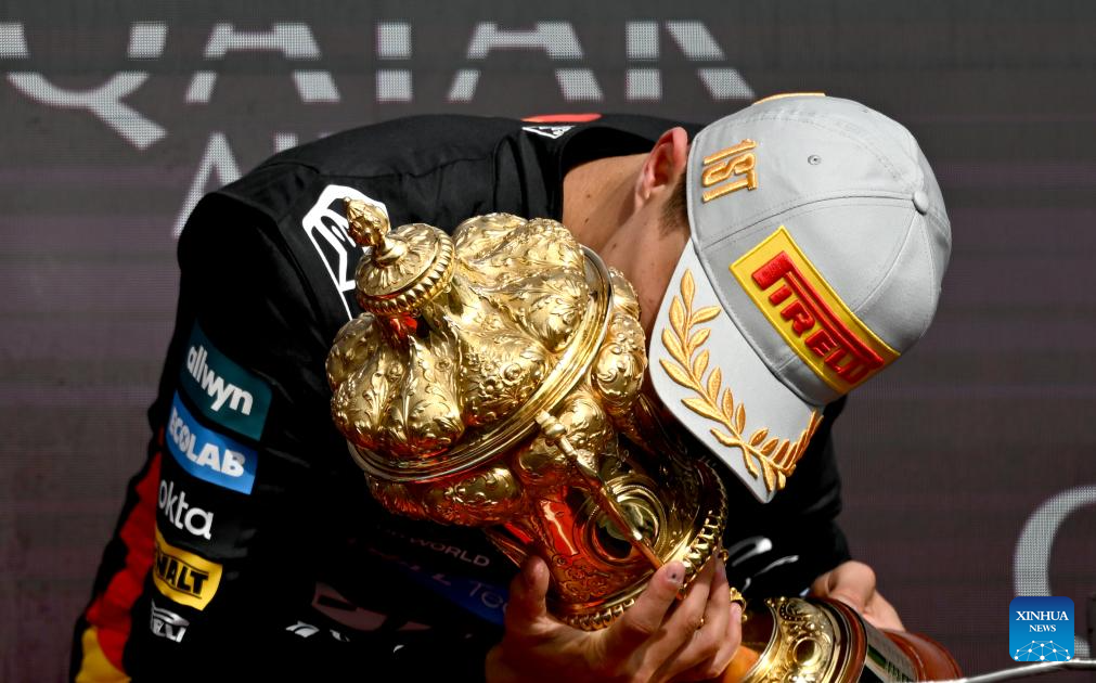 LONDRES, 7 julio, 2025 (Xinhua) -- Imagen del 6 de julio de 2025 del piloto británico de la escudería McLaren, Lando Norris, besando su trofeo durante la ceremonia de premiación del Gran Premio de Reino Unido de Fórmula Uno 2025, en el Circuito de Silverstone, en Londres, Reino Unido. (Xinhua/Li Ying)