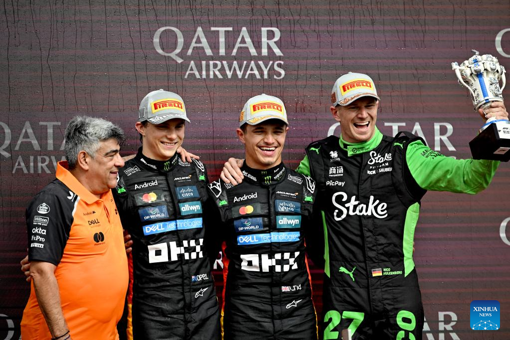 LONDRES, 7 julio, 2025 (Xinhua) -- Imagen del 6 de julio de 2025 del piloto británico de la escudería McLaren, Lando Norris (2-d), el piloto alemán de la escudería Kick Sauber, Nico Hulkenberg (d), y el piloto australiano de la escudería McLaren, Oscar Piastri (2-i), posando para una fotografía grupal durante la ceremonia de premiación del Gran Premio de Reino Unido de Fórmula Uno 2025, en el Circuito de Silverstone, en Londres, Reino Unido. (Xinhua/Li Ying)