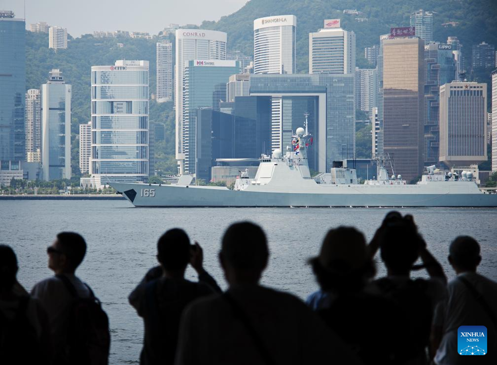 HONG KONG, 7 julio, 2025 (Xinhua) -- El destructor de misiles Zhanjiang zarpa del Puerto Victoria, en Hong Kong, en el sur de China, el 7 de julio de 2025. Una flota de la Armada del Ejército Popular de Liberación (EPL) de China, liderada por el portaaviones Shandong, partió de Hong Kong, en el sur de China, el lunes por la mañana, culminando una visita de cinco días. El gobierno de la Región Administrativa Especial de Hong Kong (RAEHK) organizó una ceremonia de despedida en la Base Naval de la Isla Stonecutters. (Xinhua/Wang Shen)